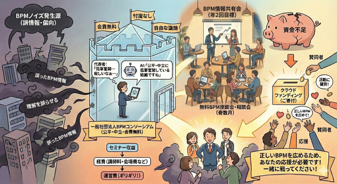 これはBPMの「ノイズ」(BPMの理解、判断を誤る情報)を発信している組織、企業に対抗するためです。そのための資金が不足しているため、会費の代わりとしてクラウドファンディングで「ご寄付」をいただくことを考えました。(業務の改革・改善成果を生み出す「正しいBPM」を広めたい。BPMコンソーシアムを応援してください。参照)