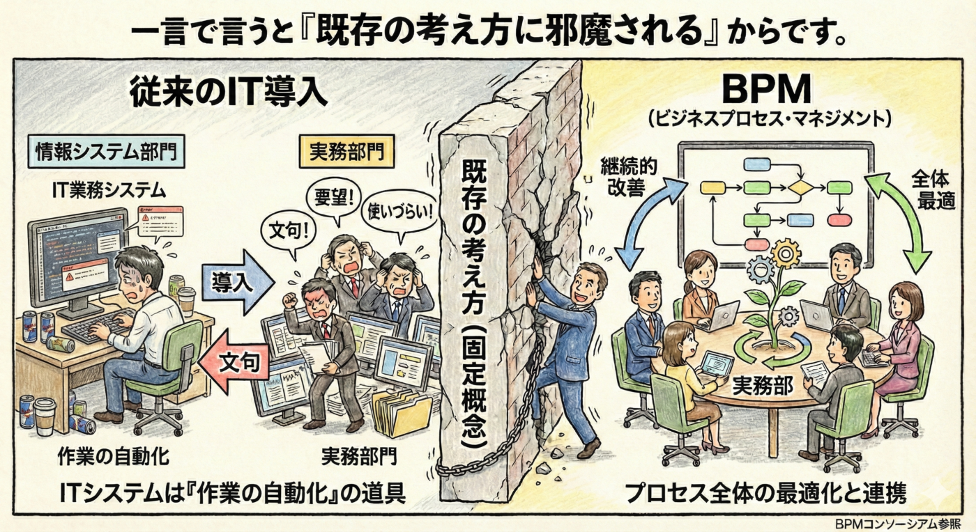 ・ITシステムは情報システム部門が中心となって導入する。実務部門は要望して完成したアプリケーションや機能に文句を言う。【BPM(ビジネスプロセス・マネジメント)とは:DXで再注目されているBPMを正しく解説を参照】