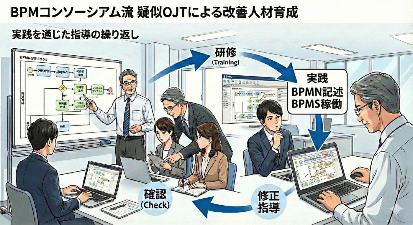 BPMコンソーシアムのご支援の基本はOJTです。OJTの定義は職場での通常業務を通じて、上司や先輩が新入社員や未経験者に指導・教育を行う人材育成手法とされているようです。我々が疑似的な上司や先輩になって、改善業務を実行するご支援しBPMを行う改善人材を育成していきます。コンサル会社では「伴走支援」という言葉を使っているようですが我々の支援は伴走でもないと思います。